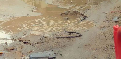經現場調查,這條電線原來是坐落路面下方,且有塑料管維護,而現在路面和塑料管均呈現破損,導致電線直接暴顯露來。